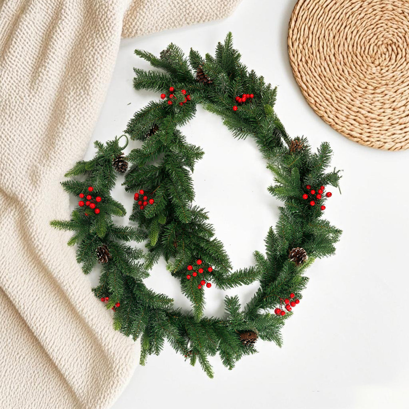 105 Inch Xmas PE Plain Green Garland w/Pinecones and Red Berries ,Christmas Wreath Decorations Garland XMAS Pine Cone Imperial Fireplace Table Wall, Christmas Garland Decorations Durable & Bendable Lifelike Branches, Holiday Greenery Christmas Garland