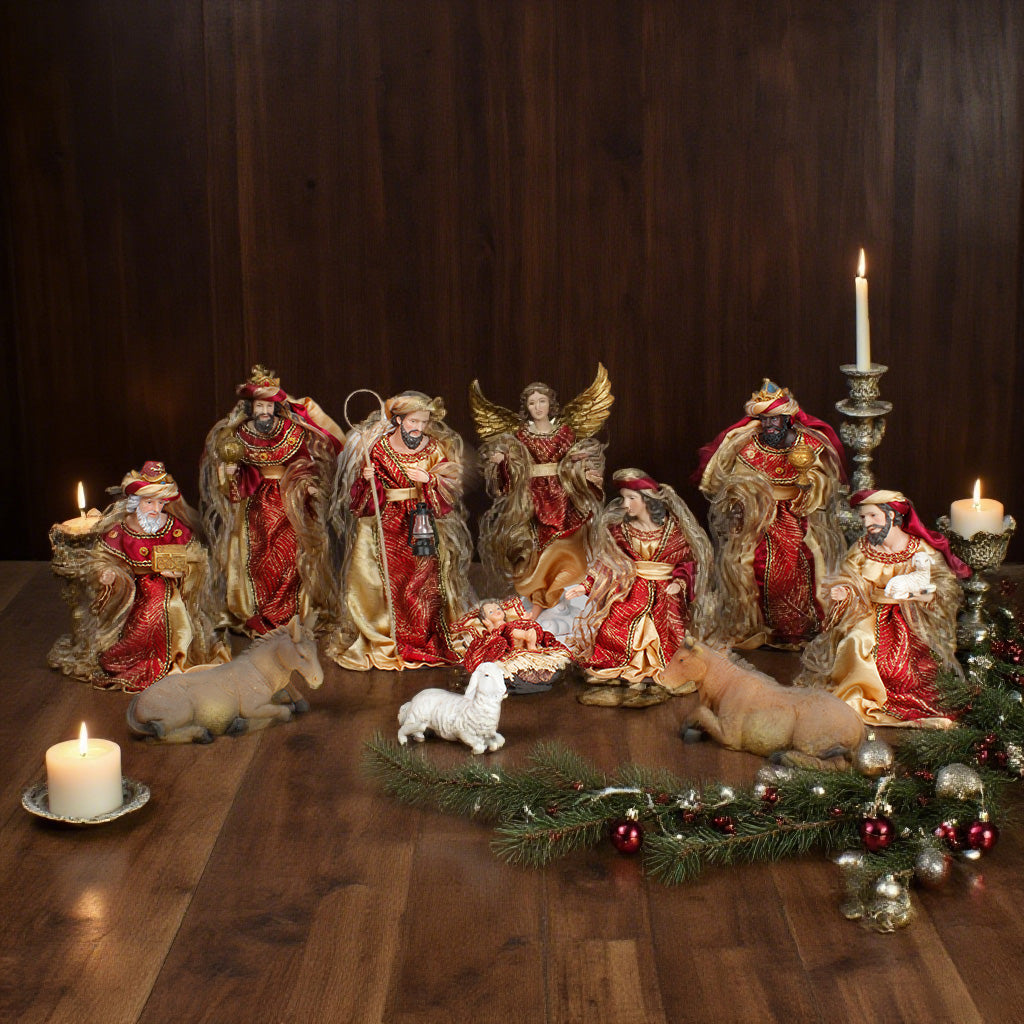 12 Inch Fabric Nativity Set Red, set 11pcs,Nativity Christmas Set Red Fabric Clothes, Christmas Resin Scenes Figures Sets Tabletop,Christmas Collectibles Figurines Statue Decor,Handcrafted Resin Nativity Set Fabric Clothes Traditional Christmas Figurine