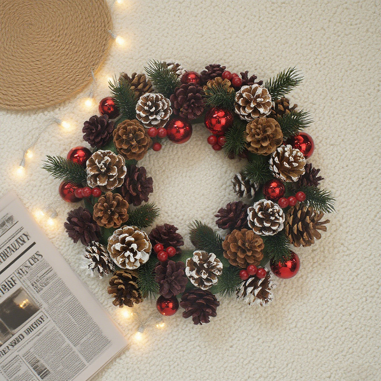 12 Inch Full Cones, Balls and Berries Wreath,Christmas Traditional Woodland Wreath, Candle Holder,Table Centrepiece, Small Wall or Door Hung, Natural Foliage, Pinecone, Red Berries, Snow