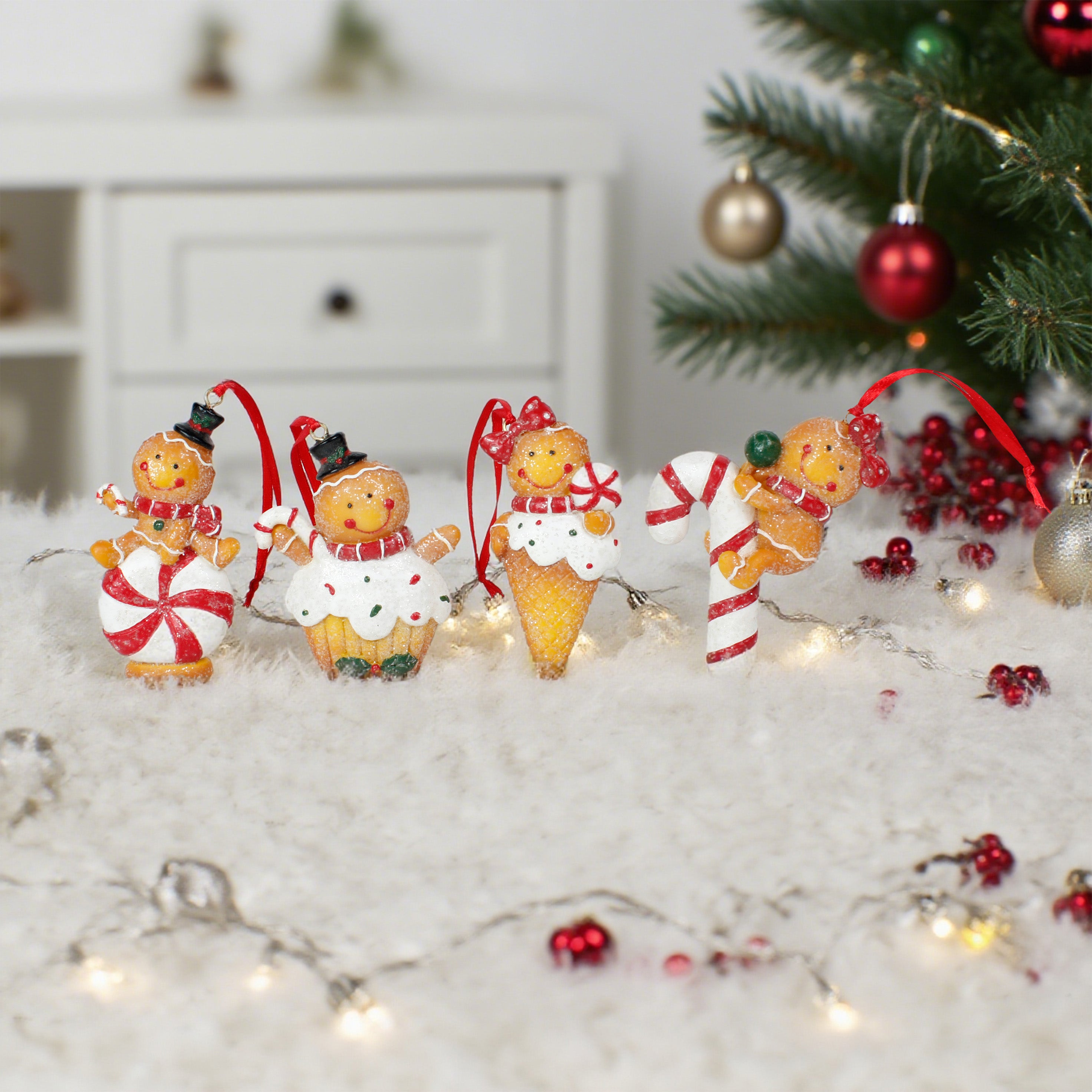 3 Inch Gingerman Ornaments ASST 4,Gingerman with Sweets Christmas Tree Ornaments, Gingerbread Tree Hanger, Xmas Resin Decorations, Iced Resin Gingerbread Biscuit Christmas Baking Tree Decorations,