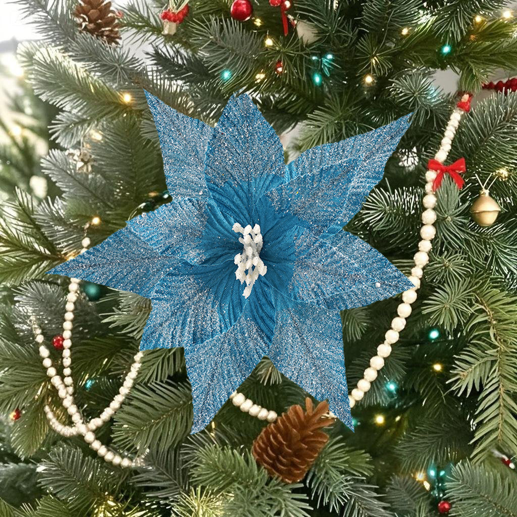 9 Inch Blue Christmas Flowers with Snows,Silk Shinning Sprakled Glitter Poinsettia Artificial Flower for Xmas Tree Christmas Decorations,Festive Holiday Tree Decoration, Wreath Ornament, Party Decor